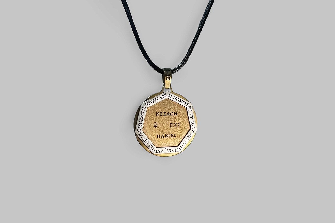 The mixed metals echo the sphere’s vitality – silver for the moonlit veil of emotion, bronze and brass for the warm, earthly fire of creative instinct – while the seven sides honour the fullness of Netzach’s victory. The septagon itself resists rigid symmetry, inviting perception rather than analysis. To contemplate or wear the septagon is to step into that current of living beauty, where love becomes both the force that binds the cosmos and the grace that frees the heart.