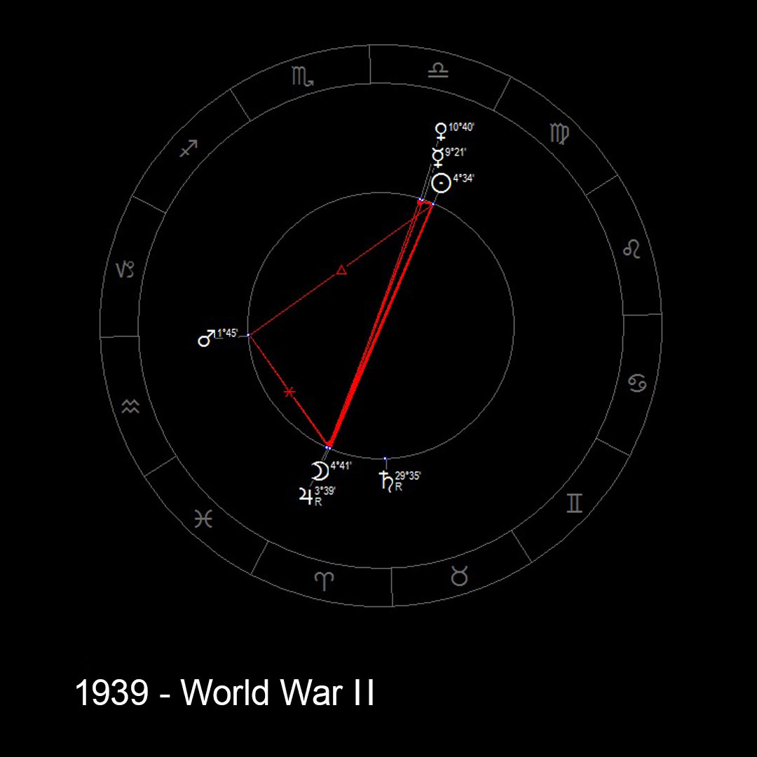 September 1939: A severely afflicted Saturn, a strong Mars influences all other planets, which are combust and in opposition to Jupiter – the beginning of World War II.
