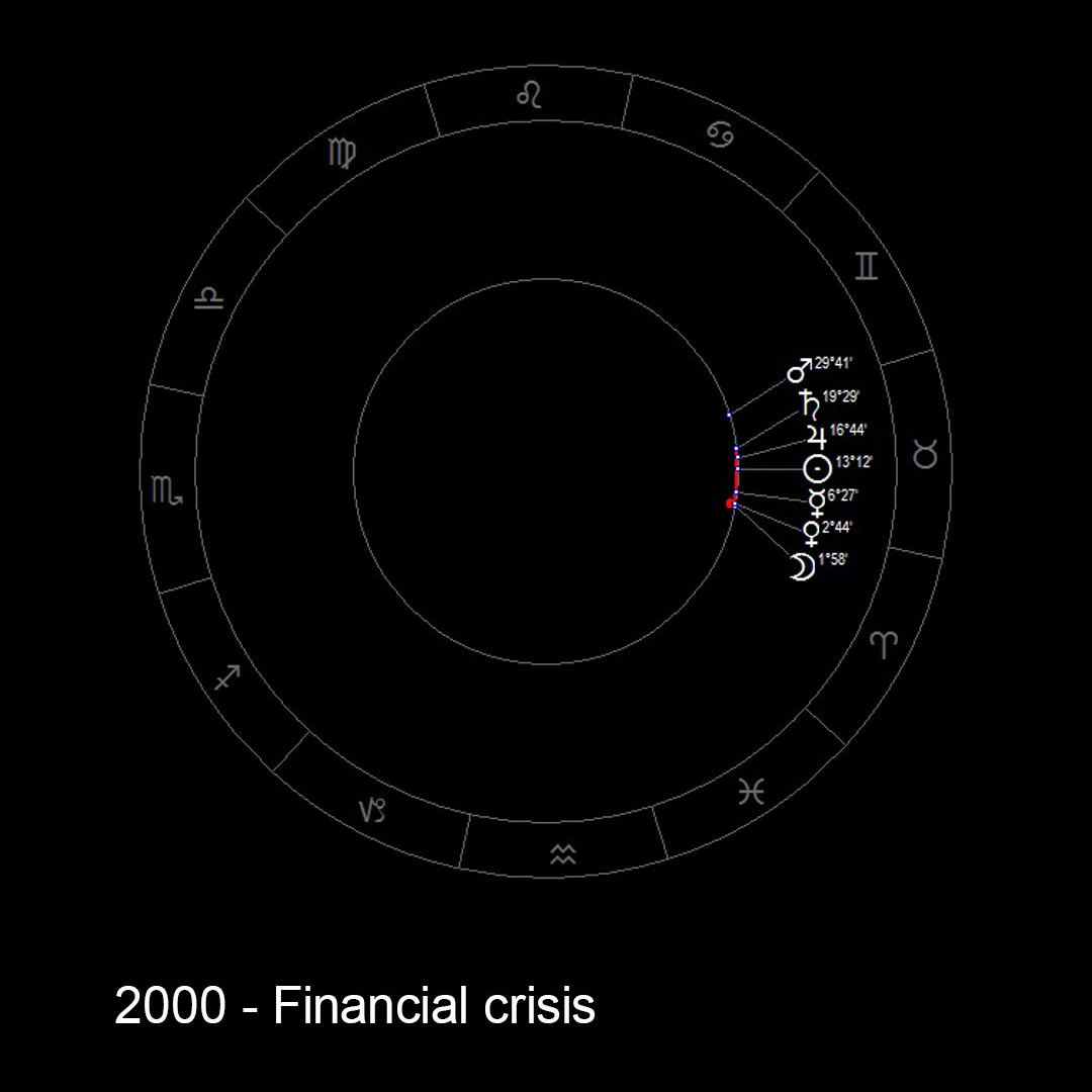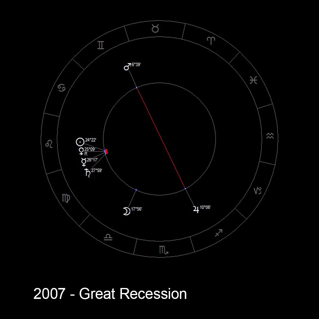 Summer 2007: The Sun combusts Saturn and the inferior planets in opposition to Jupiter and Mars – a global economic crisis.