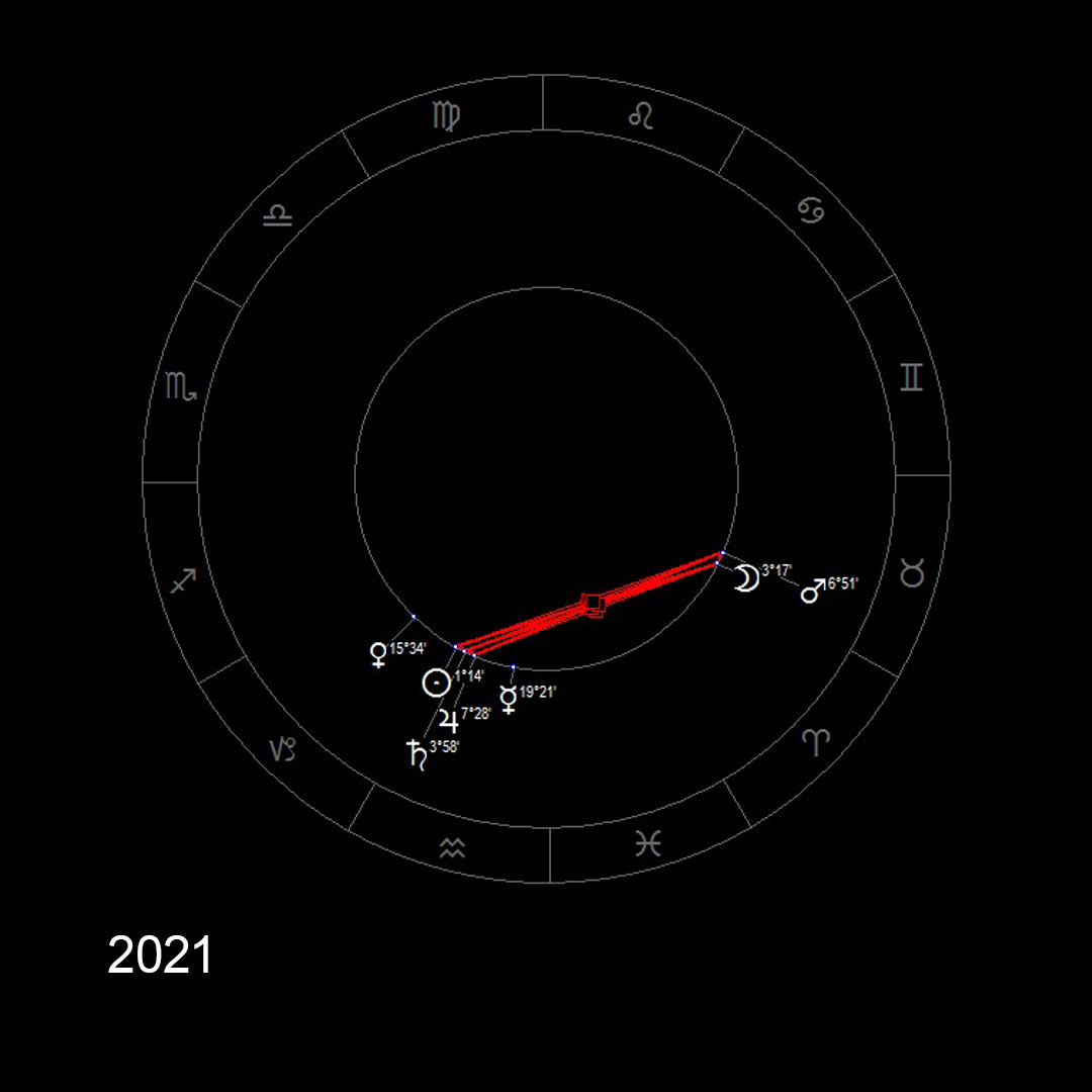 Winter 2020–2021: The Sun in detriment combusts Saturn and Jupiter in a square to Mars – the situation in Eastern Europe escalates, and already a year later the Russian–Ukrainian war unfolds on a broad front, drawing in an increasing number of countries.
